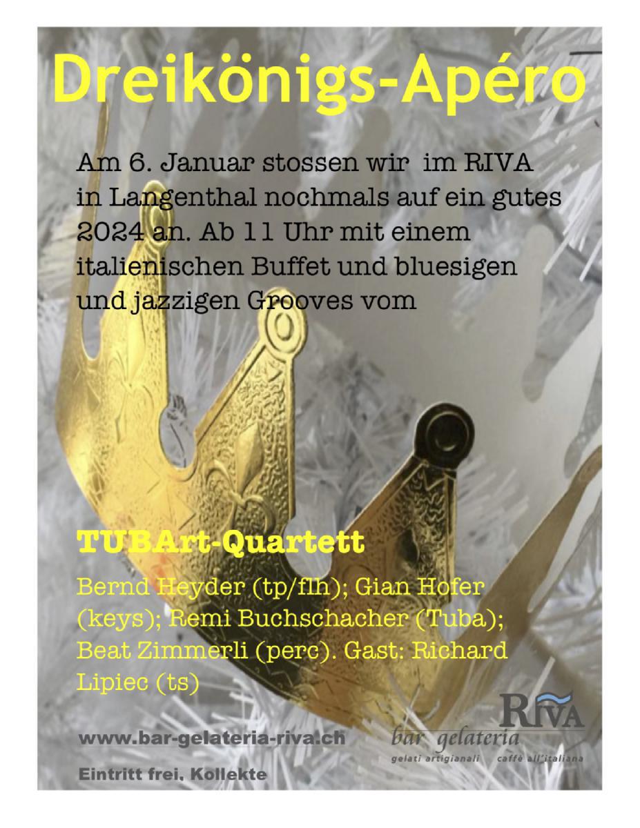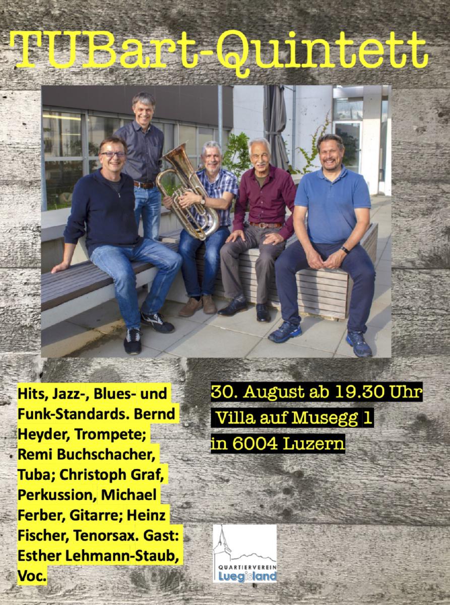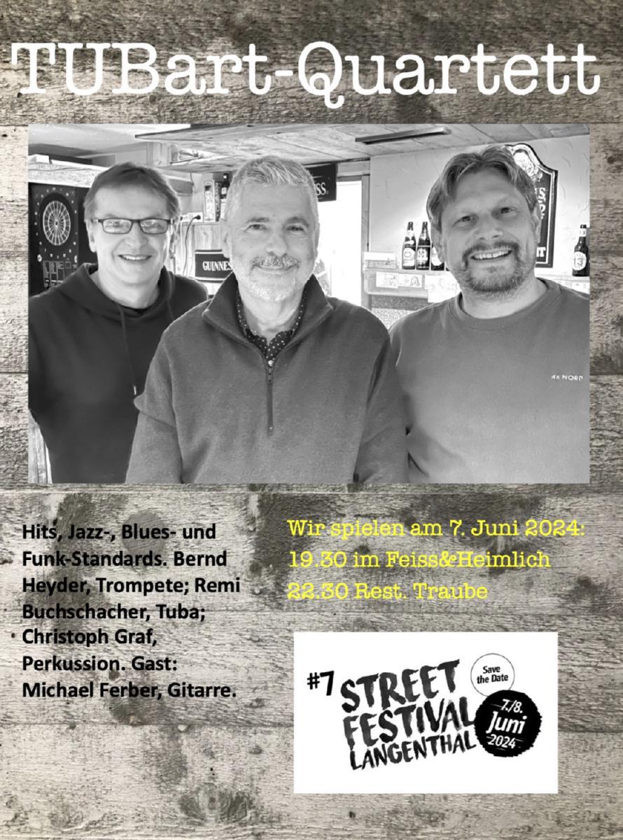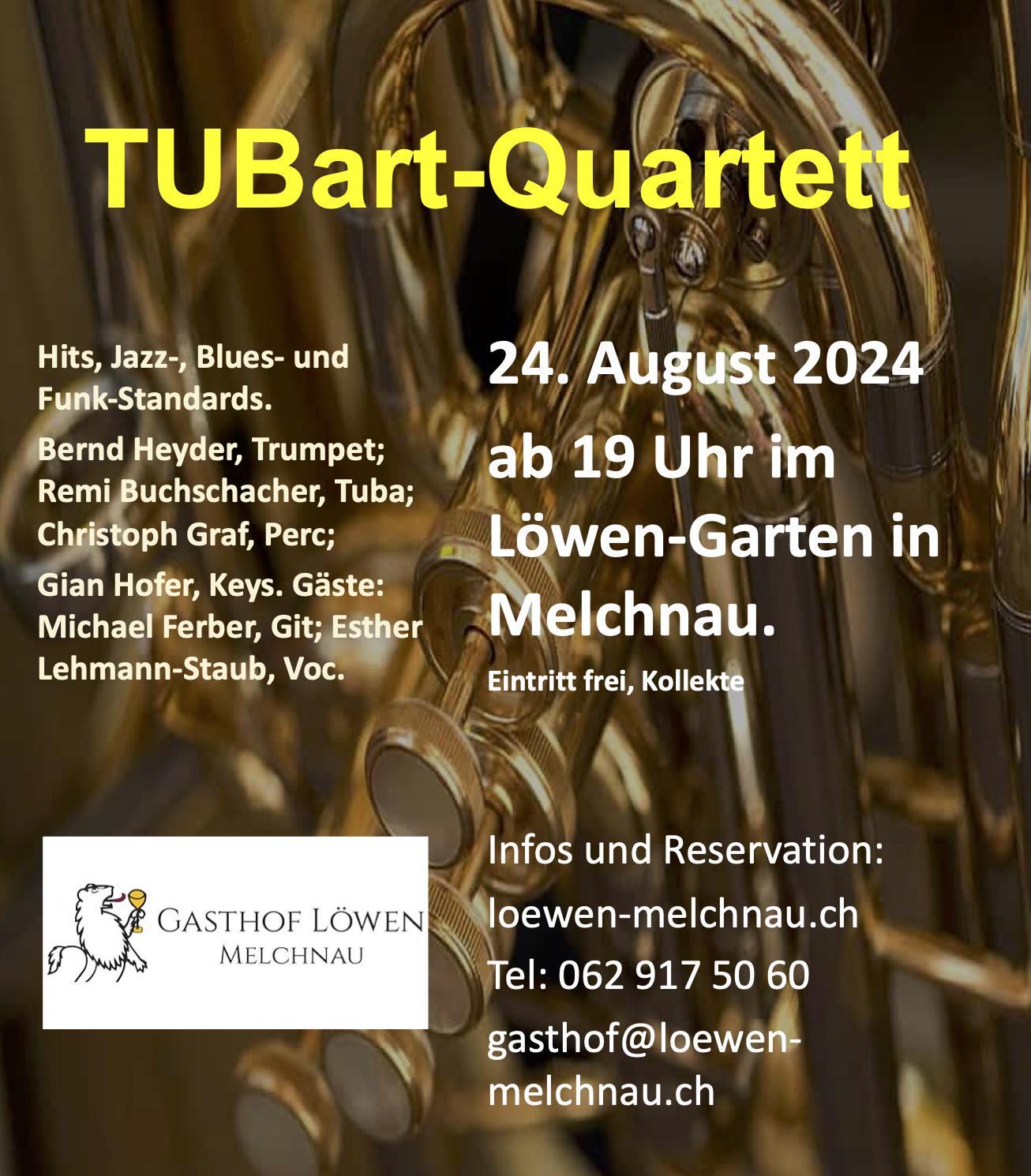 Die Tuba ist das Instrument des Jahres 2024. Tiefenentspannt sorgt sie in Bläserensembles und Orchestern für satten, dunklen Sound. Die Sechziger-, Siebziger- und Achtzigerjahre bieten einen wunderbaren Fundus an Hits sowie Jazz-, Blues- und Funk-Standards, die unvergänglich sind. Sie bilden die Grundlage für das Repertoire vom «TUBart-Quartett» – allerdings nicht immer in den Originalversionen, sondern in veränderter und teils überraschend neu arrangierter Form. Bernd Heyder, Trompete; Remi Buchschacher, Tuba; Christoph Graf, Perkussion; Michael Ferber, Gitarre; Heinz Fischer, Tenorsax; Gian Hofer, Keyboards.